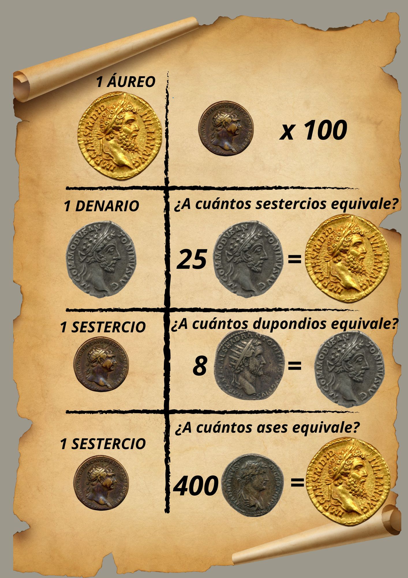 La equivalencia de todas las monedas romanas en sestercios queda reflejada en la siguiente imagen: