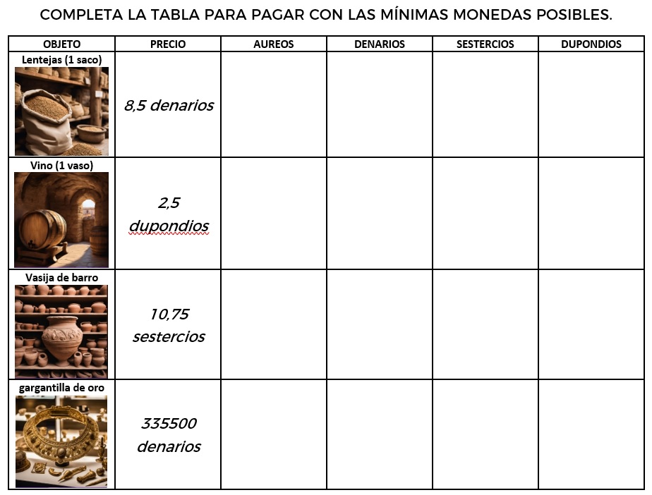 TAREA 2: una vez hallada la equivalencia entre las monedas romanas deberemos averiguar qué monedas nos harían falta para pagar los diferentes objetos y siempre intentando pagar con el mínimo número de monedas.